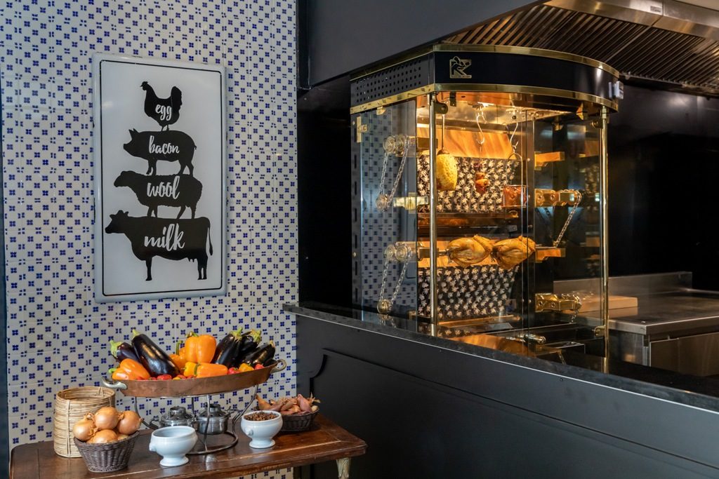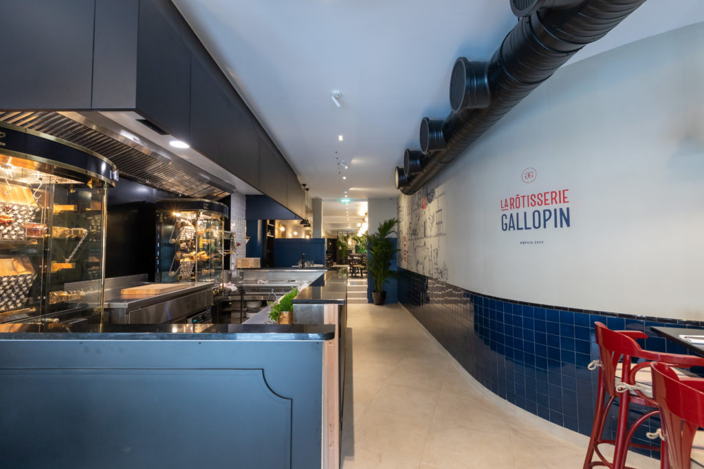 Alors que le Gallopin arbore les codes de la Belle Époque dans un esprit confidentiel – boiserie laquée, moulures, couleurs chaudes –, le Gallopin Rôtisserie s’illustre par son style contemporain et lumineux : une ambiance bleue navy pour les banquettes et murs, un sol clair dallé de pierre de Bourgogne, une illustration moderne de bêtes à rôtir au mur, et des rôtissoires high tech.